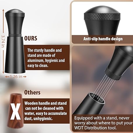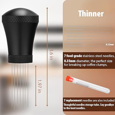 Thông tin sản phẩm WDT Espresso Distribution Tool Espresso Stirrer Tools for Barista, 0.35mm 7 Needles Espresso Coffee Stirrer with Extra 7 Replaceable Needles, Aluminum Alloy Handle with Stand (Black)