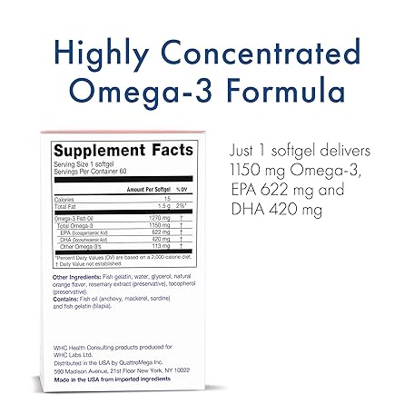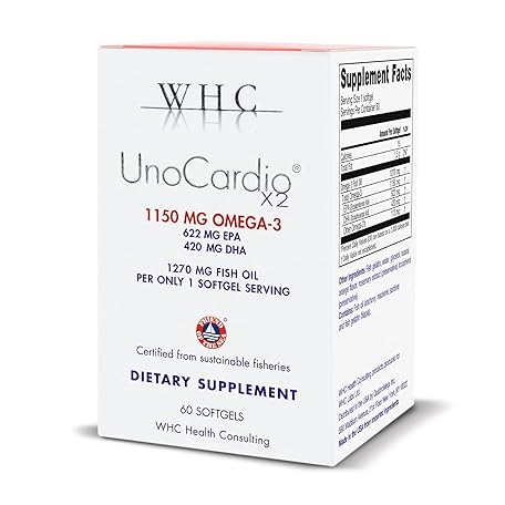 Thông tin sản phẩm WHC, UnoCardio X2 Fish Oil, Triglyceride Omega-3 Fatty acids, 1270 mg Fish Oil Supplement (622 mg EPA / 420 mg DHA/Total 1150 mg of Omega-3 per Serving), Natural Orange, 60 softgels