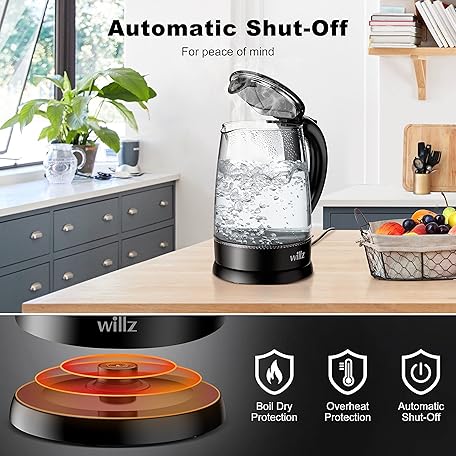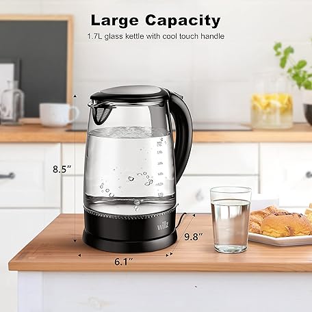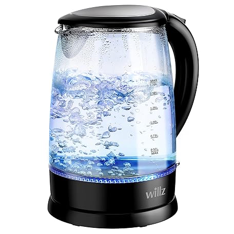 Thông tin sản phẩm Willz Electric Glass Kettle with Heat Resistant Handle and Cordless Pour, Quick Boil & Auto Shut-Off Technology, Blue Boil Light, 1.7L, 1500 W, Black