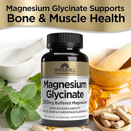 Windmill Natural Vitamins Magnesium Glycinate 200 mg, Supports Muscle, Joint, and Heart Health, Energy and Bone Support, Veggie Capsules, Gluten Free, Vegan, Non-GMO, 120 Capsules