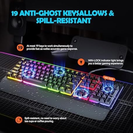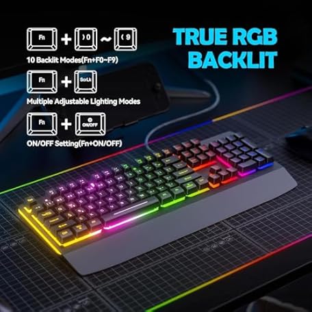 Thông tin sản phẩm Wired Gaming Keyboard,RGB Light Up Keyboard with Wrist Rest,104Keys All Metal Panel Rainbow Backlit for Gaming,Silent Computer with Multimedia Anti-ghosting Keys for PC Mac Xbox K518