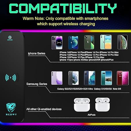 Thương hiệu NGDWY là cái tên nổi tiếng được rất nhiều khách hàng trên thế giới chọn lựa. Với kiểu dáng đẹp mắt, sang trọng, sản phẩm Wireless Charging RGB Gaming Mouse Pad 15W -800x300x4MM-Fast Charging, Ultra-Smooth Surface, Non-Slip Base, 13 Light Modes - Ultimate RGB Mouse Pad for Gamers - Large Mouse Pad Gaming Mat là sự lựa chọn hoàn hảo nếu bạn đang tìm mua một món cho riêng mình.