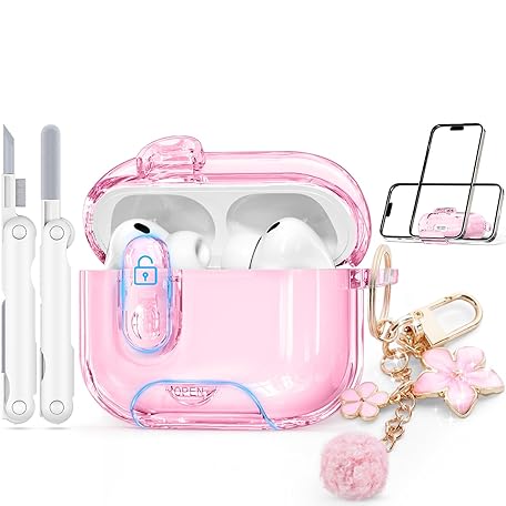 with Safety Lock for AirPods Pro 3 Case 2025,Clear Cases with Phone Stand & Cleaning Kit,Soft TPU Cover for Airpods Pro 3rd Generation Case,Cute Bling Keychain for Women Girls-Pink