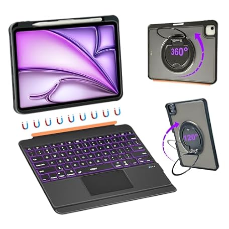 WIWU iPad Keyboard Case Air 13 Inch 360° Stand Magnetic Detachable Case with Keyboard 7 Color Backlit Keys Trackpad with Pencil Holder Black (for Air 13"(M3/M2) Pro 12.9" 6/5/4/3)