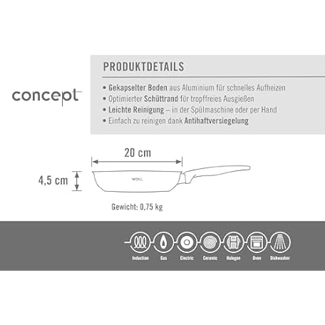 Thông tin sản phẩm Woll 520NC Concept Stainless Steel Frying Pan Coating, Suitable for Induction Cookers, Diameter 20 cm, Height 4.5 cm