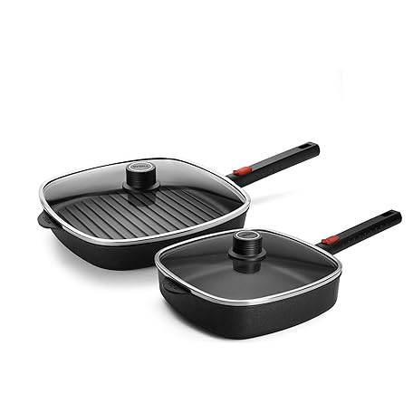 Woll Logic 4-Piece Pan Set with Square & Grill Pans, Inductive Lids, Cast Aluminium, Non-Stick Coating, Oven-Safe, 30% More Content, Handmade in Germany, Dishwasher-Safe