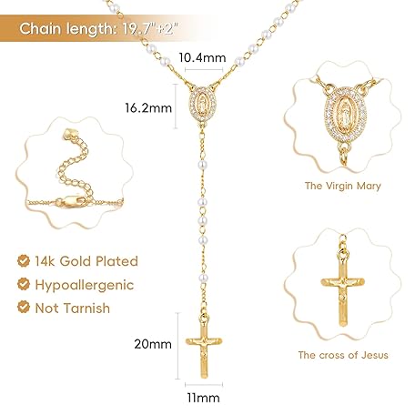 Women's Gold Virgin Mary Necklace - 14k Gold Plated Rosary Bead Cross Necklaces,Hypoallergenic Non Tarnish Gold Catholic Y Chain Necklace,Religious Rosary Beads Crucifix Necklaces Jewelry Gift for Her