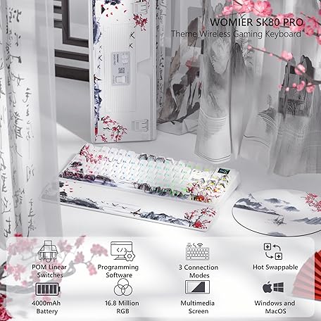 Thông tin sản phẩm Womier 75% Wireless Mechanical Keyboard with Color Multimedia Screen Gaming Creamy Keyboard, Theme 3-Modes Hot Swappable Key Board w/Wrist Rest,SK80 PRO Gasket RGB Custom for Mac/Win,Red Plum