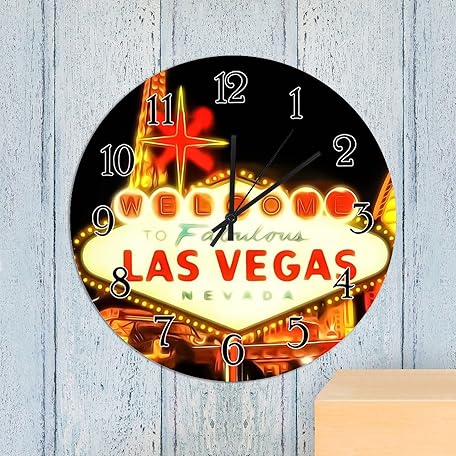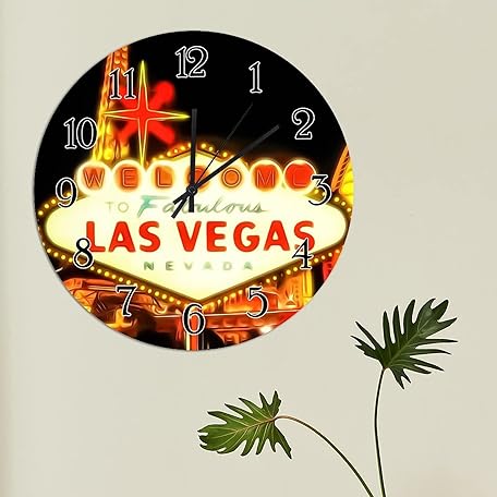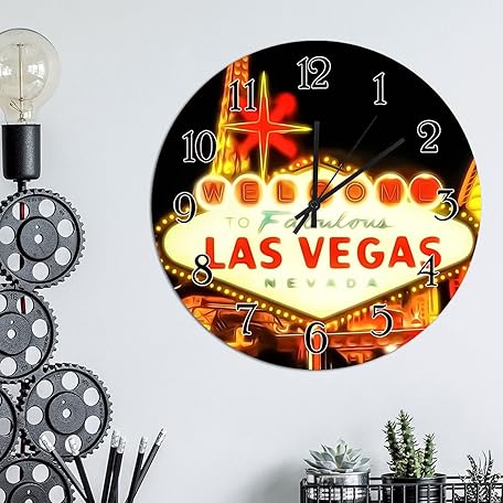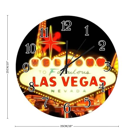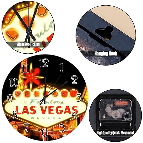 Wooden Wall Clock USA City Casino Las Vegas Wall Clock Silent Non-Ticking Wood Clocks City in Nevada State Round Wall Clocks City Souvenir Clocks for Home Office 10inch