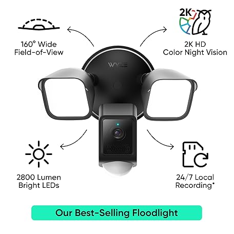 Thông tin sản phẩm WYZE Floodlight Camera v2, Security Camera Outdoor, 2K HD with Color Night Vision, 2800-Lumen LEDs, 160° Wide View, 105dB Siren, Works with Alexa & Google Assistant, Wired, Free Expert Support