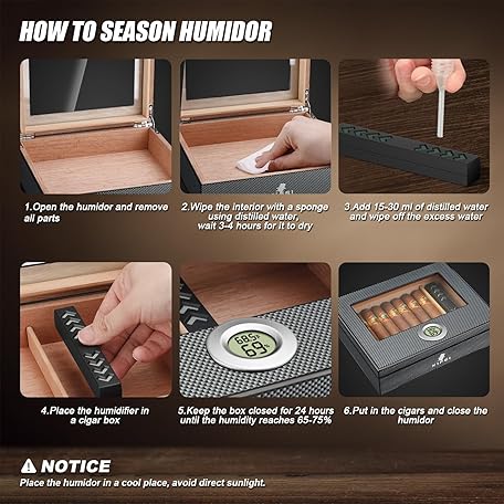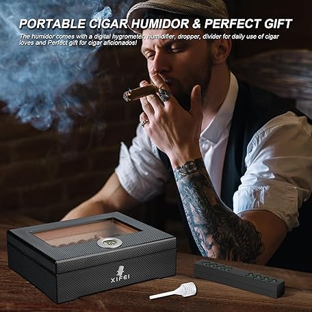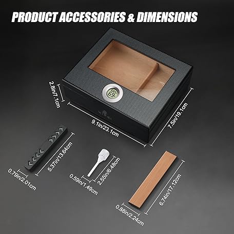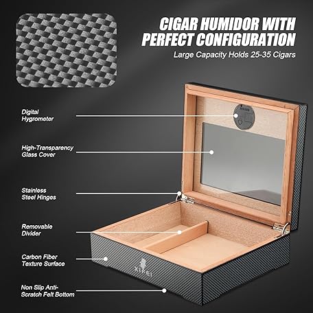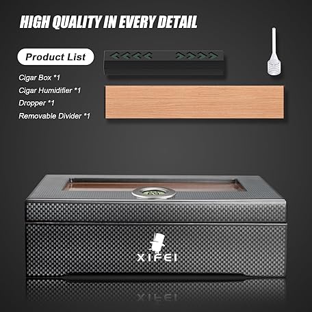 Thông tin sản phẩm XIFEI Cigar Humidor, Glass Top Carbon Fiber Texture with Digital Hygrometer, Including Cigar humidifier, Divider, Cedar Wood Humidor Box, Holds 25-35 Cigars (9IN*7.5 * 2.8)