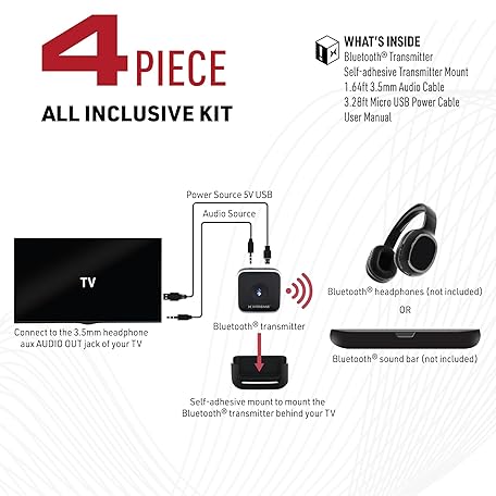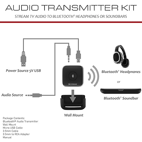 Thông tin sản phẩm Xtreme 4-Piece Audio Transmitter Kit, Stream Audio to Bluetooth Compatible Headphones/Soundbars, Comes with Transmitter/Wall Mount/Micro-USB Cable/3.5mm Cable, Rechargeable