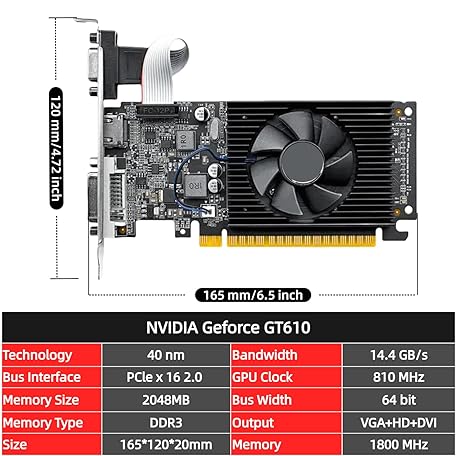 Thông tin sản phẩm XUANMO NVIDIA GeForce 2.0 GT610 Low Profile PC 2GB Graphics Card 64bit 810MHZ, 2560x1600 PC Video Card, PCI Express 2.0, DVI VGA HDMI Video Gaming Graphics Card