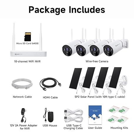 Thông tin sản phẩm yeewise Solar Security Cameras Wireless Outdoor, 2K 4MP Home Security System, 4 Cameras Kit with Color Night Vision, Forever Power, Spotlight Camera, 10CH NVR with 64G Local Storage, No Monthly Fee
