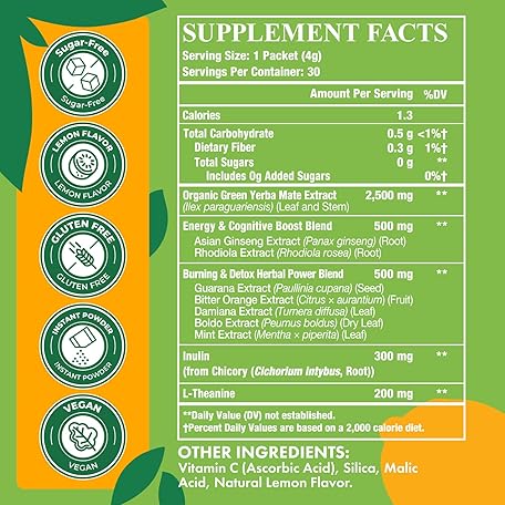 Yerba Mate 4000mg, 10 in 1 Super Yerba Mate Tea Instant Powder - No Sugar, Clean Energy with No Crash, Stay Refreshed and Focused, Gut Health, with Ginseng, Rhodiola, Prebiotic, L-Theanine, 30 Packets