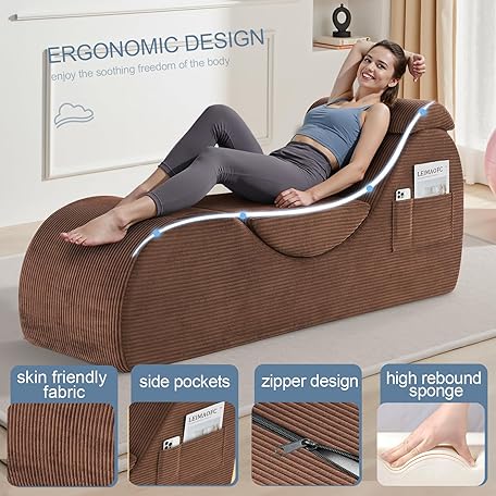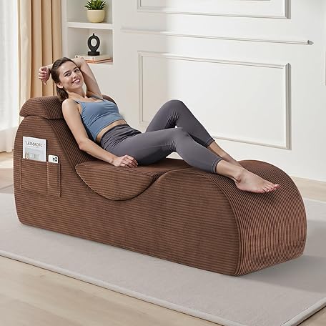 Yoga Chair Lounge for Adult, Ergonomic Chaise Lounge Chair with Side Pocket, Headrest, Waist Pad, Perfect for Stretching, Massage, and Relaxation, Used in Living Room, Bedroom(Brown)