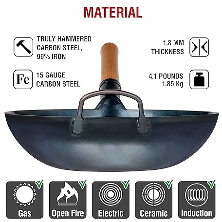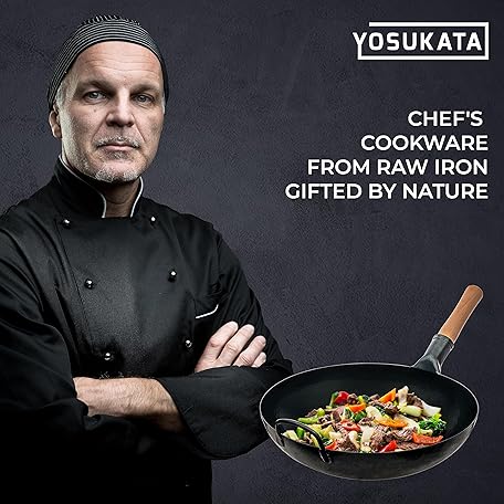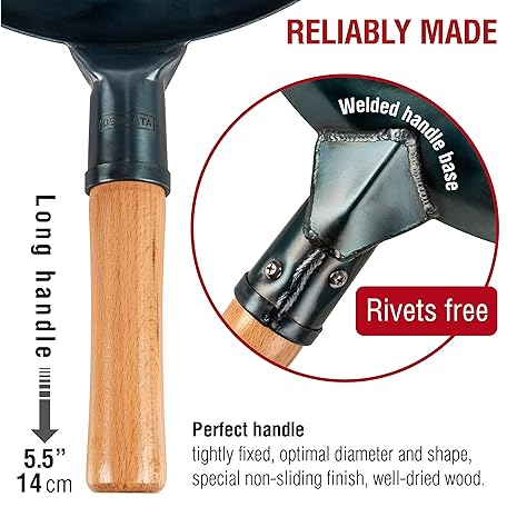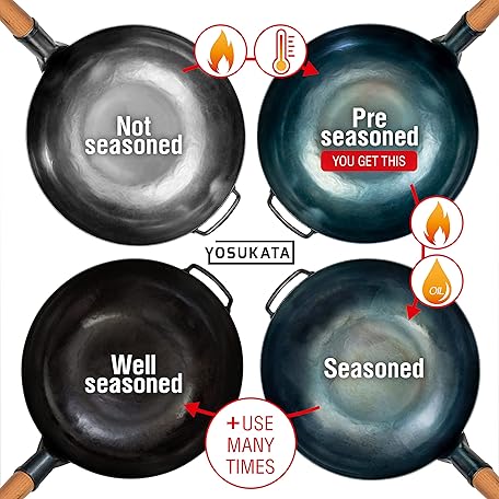 Thông tin sản phẩm YOSUKATA 13.5” Blue Carbon Steel Wok Pan – Pre-Seasoned Flat Bottom Wok Compatible with open fire, gas, electric, ceramic, induction cooktops -Traditional Chinese Pan for Stir Fry, BBQ, Grill, Camping