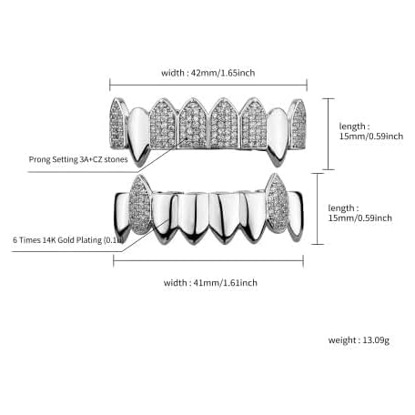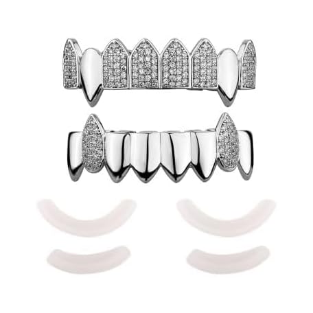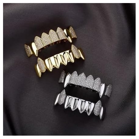 YOSZO 18K Gold Plated Vampire Fangs Teeth Caps Iced Out CZ Top and Bottom Vampire Fangs Grillz for men women