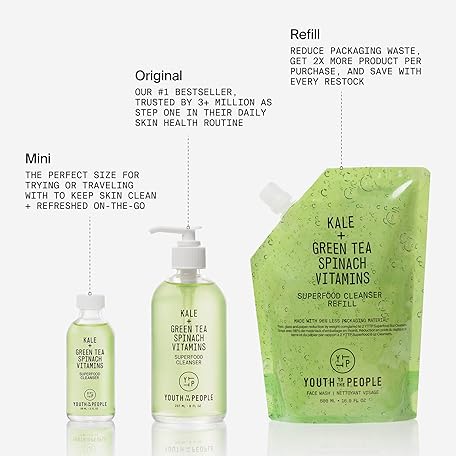 Thông tin sản phẩm Youth To The People Superfood Facial Cleanser - Kale + Green Tea Daily Face Wash, Gentle Makeup Remover, with Soothing Antioxidants for Glowing Skin, pH Balance, Clean Pores, Sulfate-free, Refillable