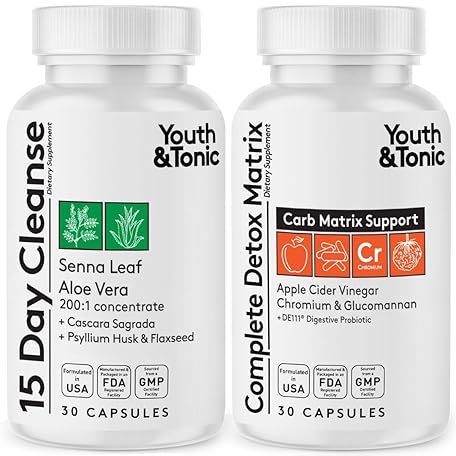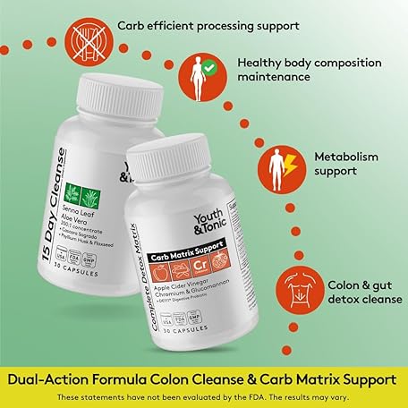 Thông tin sản phẩm Youth & Tonic 15 Day Cleanse & Carb Matrix Support for Bloating, Gut & Metabolism Health, Break The Plateau, Feel Lighter & Energized, Colon Cleanser & Detox with ACV, Glucomannan, Chromium, 60 Pills