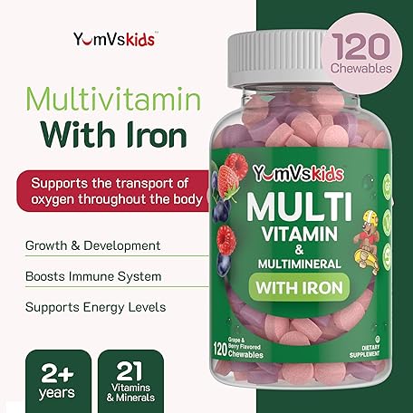 Thông tin sản phẩm YumVs Kids Multivitamin with Iron & Minerals Chewable Tablets – Grape & Berry Flavor Vitamins for Toddlers & Children Age 2+ – Daily Multivitamin for Immune Support – Kosher, Non-GMO – 120 Chewables