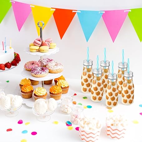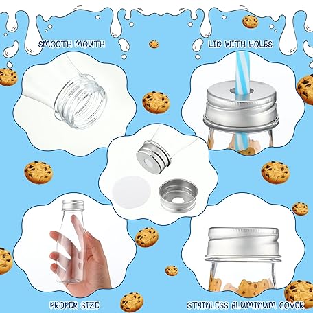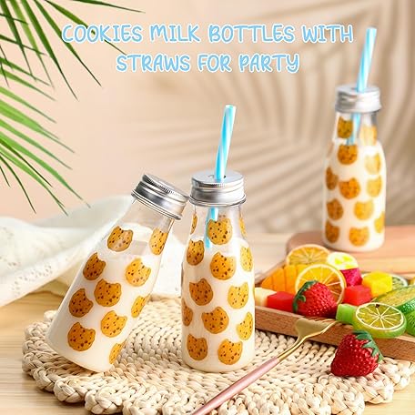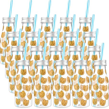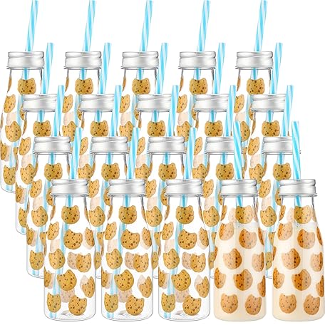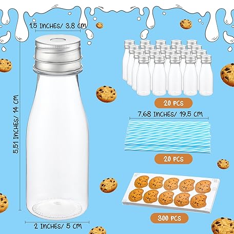 Yungyan 20 Pcs Plastic Cookies Milk Bottles with Straws and Lids Small Clear Milk Jar with Lids Mini Juice Bottles and 300 Sticker Labels for Theme Birthday Party Baby Shower