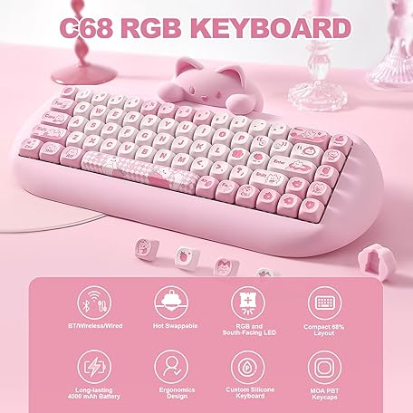 Thông tin sản phẩm YUNZII C68 Wireless Mechanical Keyboard,65% Layout,Hot Swap,Triple Mode BT5.0/2.4G/Wired, RGB Backlit NKRO,Cute Cat Silicone Ergonomic Design for Win/Mac (Pink, Milk Switch)