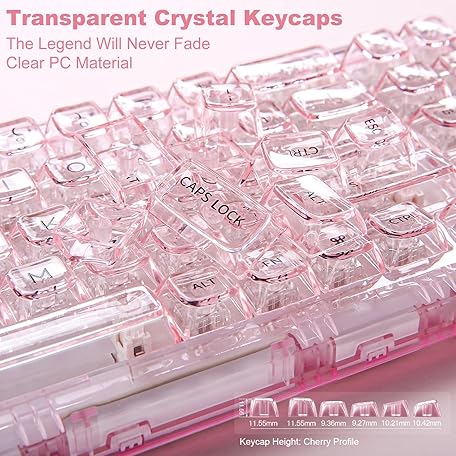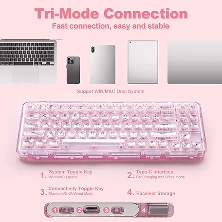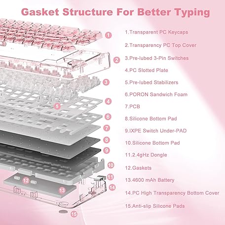 Thông tin sản phẩm YUNZII X71 Wireless Hot Swappable Transparent Mechanical Keyboard with Clear Keycaps, 68% Layout, BT5.0/2.4G/USB-C Gasket Mount Wireless RGB Backlit for Windows/Mac(Crystal Ice Switch,Pink)