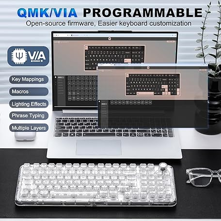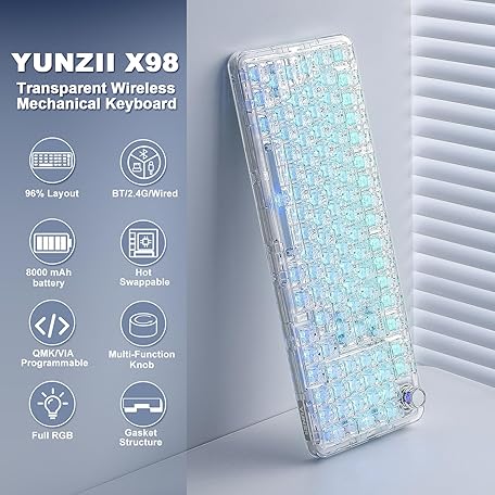 Thông tin sản phẩm YUNZII X98 QMK/VIA Wireless Mechanical Gaming Keyboard with Knob,Tri-Mode BT5.0/USB-C/2.4GHz Hot Swappable Keyboard,Pre-lubed Switches Gasket Mount RGB Backlit for Wins/Mac (White, Snow Switch)