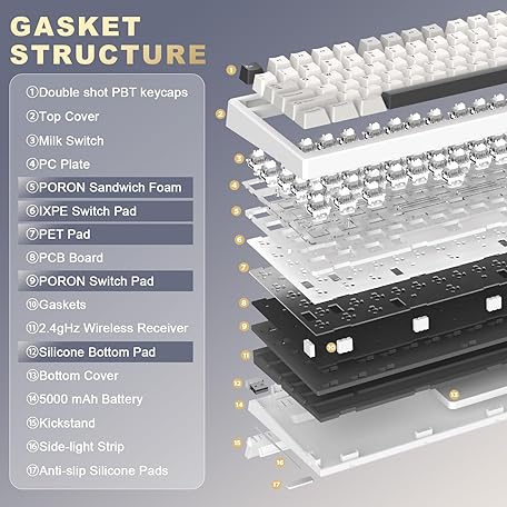 Thông tin sản phẩm YUNZII YZ98 Gasket Mechanical Keyboard,99 Key Hot Swappable BT5.0/2.4G/USB-C Wireless NKRO 98% 1800 Layout with RGB LED Backlit for Linux/Win/Mac(Milk Switch, White)