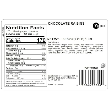 Thông tin sản phẩm Yupik Milk Chocolate Covered Raisins, 2.2 lb (35.2 oz), Kosher, Raisins Dipped in Fine Milk Chocolate, Smooth & Chewy, Chocolate Candy, Sweet Snacks, Ideal for Topping & Baking