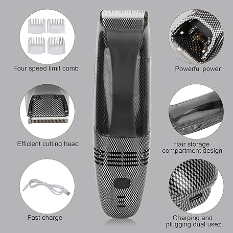 YUYTE Hair Trimmer USB Vacuum Trimmer Kit with Powerful Automatic Hair Suction for Beards Facial Hair Stubble Hair Clipping Lithium Ion Powered Electric Shaver with 4 Guide Combs