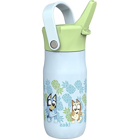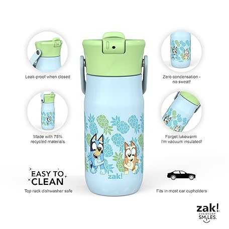 Thông tin sản phẩm Zak Designs Harmony Bluey Kid Water Bottle for Travel or At Home, 14oz Recycled Stainless Steel is Leak-Proof When Closed and Vacuum Insulated (Bluey, Bingo, Muffin)
