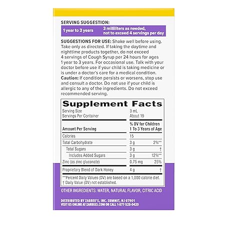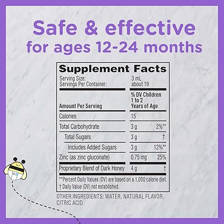 Thông tin sản phẩm Zarbee's Baby Honey Cough Syrup + Immune for Babies 12-24 Months, Safe & Effective Cough Syrup with Soothing Dark Honey & Zinc for Immune Support*, Drug & Alcohol-Free, Grape, 2 fl. Oz