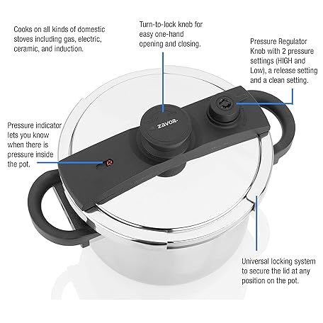 Thông tin sản phẩm Zavor EZLock Stove Top Pressure Cooker 7 Quart - Stainless Steel, Multi Pressure Levels, Easy Locking, Induction Ready, Digital Cookbook & Steamer Basket | Olla de Presion Acero Inoxidable