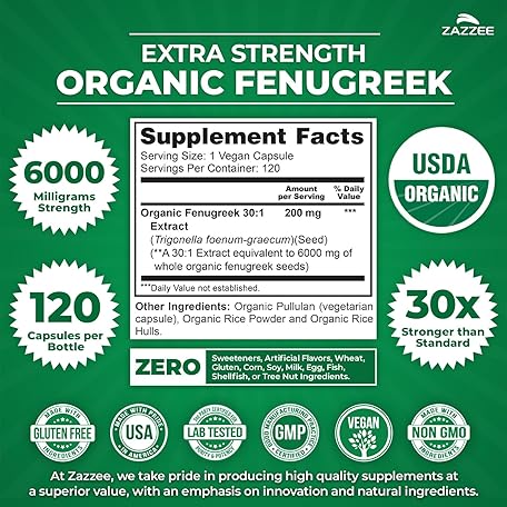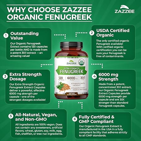 Thông tin sản phẩm Zazzee USDA Organic Fenugreek 30:1 Extract, 6000 mg Strength, 120 Vegan Capsules, 4 Month Supply, Standardized and Concentrated 30X Extract, 100% Vegetarian, All-Natural and Non-GMO