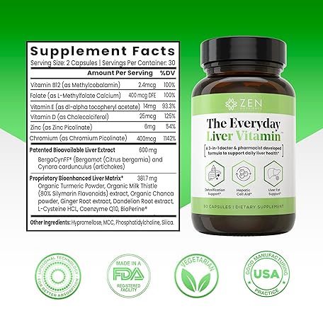 Thông tin sản phẩm Zen Nutrients The Everyday Liver Vitamin - Liver Cleanse Detox & Repair with Bergacyn FF, Organic Milk Thistle, Dandelion Root & Artichoke Extract for Liver Health - Fatty Liver Support Supplements