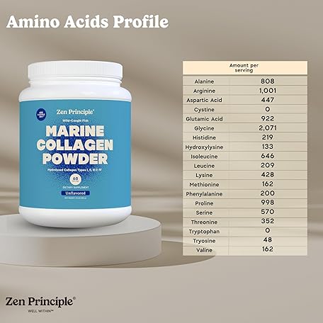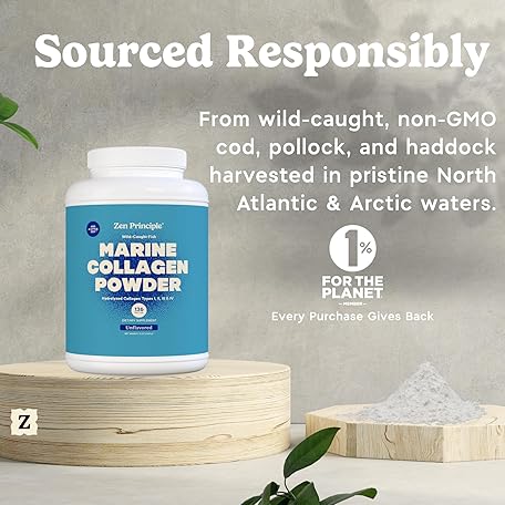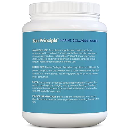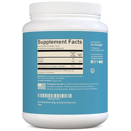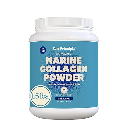 Thông tin sản phẩm Zen Principle Marine Collagen Peptides Powder 1.5 lb. Wild-Caught Fish, Non-GMO. Supports Healthy Skin, Hair, Joints and Bones.Hydrolyzed Type 1 & 3 Protein. Amino Acids.Unflavored, Easy to Mix.