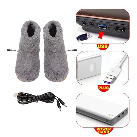 ZJchao Heated Foot Slipper with Ankle Wrap, USB Charging Soft Relaxing Electric Plush Warming Shoes for Cold Winter (Grey)