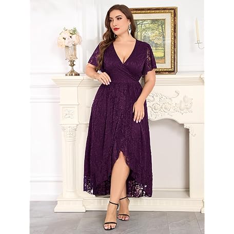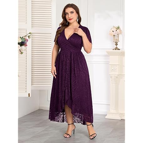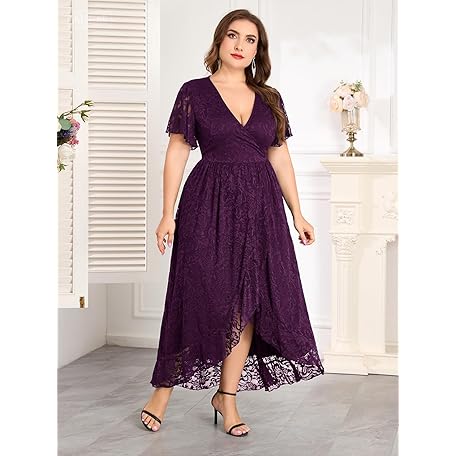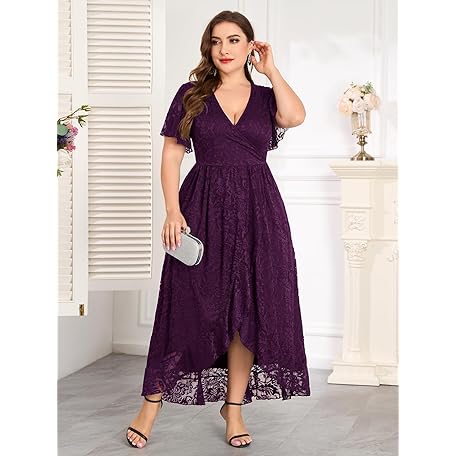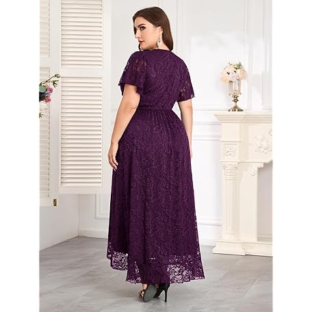 • ZOMVA Plus Size Floral Lace Dress Wrap V Neck High Low Ruffle Sleeve Evening Gown Formal Dresses Wedding Guests Cocktail