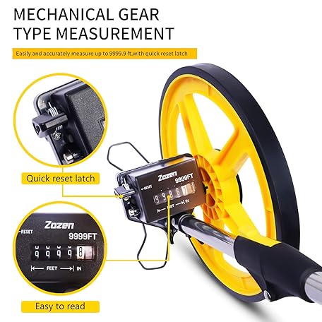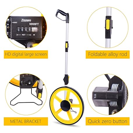 Thông tin sản phẩm Zozen Measuring Wheel, Folding Portable Distance Measuring in Feet, Double Collapsible | One Key to Reset/Kickstand to Keep Stand/Starting Point Arrow and Cloth Carrying Bag, [0-9,999 Ft].