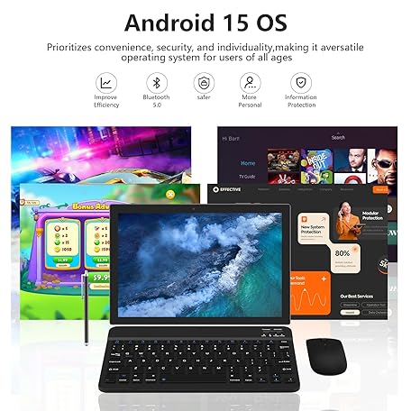 ZZB Android 15 Tablet 10 inch Tablet 2 in 1 Tablets with Keyboard Mouse Case Stylus 18GB RAM 128GB ROM 2TB Expand, Android 15(NOT GO) 10.1" IPS 6000mAh Battery Bluetooth Dual Camera 5G-WiFi Tablets.