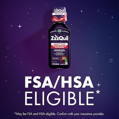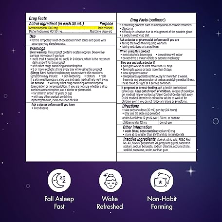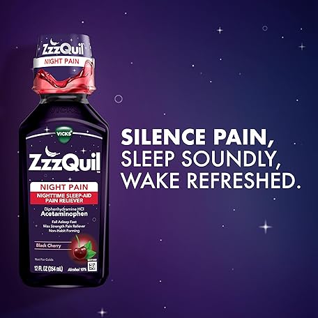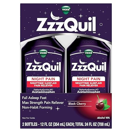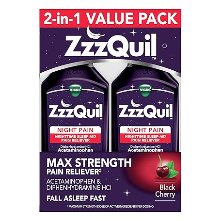 Thông tin sản phẩm ZzzQuil Liquid Max Strength Pain Reliever, Nighttime Sleep Aid Liquid, Acetaminophen 1000mg, Diphenhydramine 50mg HCI, Non-Habit Forming, Black Cherry Flavored, 2 Pack, 24 FL OZ