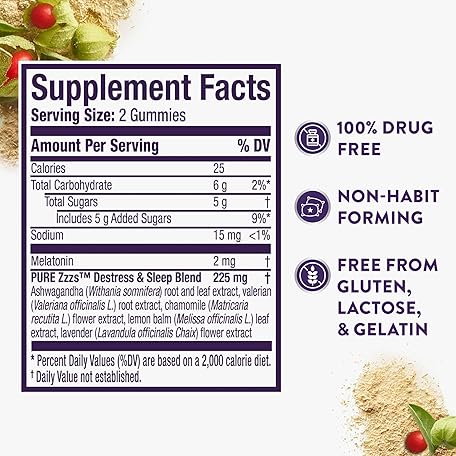 Thông tin sản phẩm ZzzQuil PURE Zzzs De-Stress 2mg Melatonin Gummies, , Sleep Aids for Adults, Ashwagandha for Stress Support, 60 Gummies